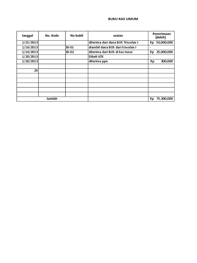 Contoh Buku Kas Tunai Bos / Buku Kas Umum Bos Pdf. Assalamu'alaikum wr.wb bapak ibu bendahara bos. Contoh pengambilan uang pada rekening untuk kas tunai. Petunjuk pembukuan buku pembantu kas tunai dan. Spjbos2020 #bos2020cara membuat spj bos sd 2020. Terima tunai dana bos triwulan/caturwulan berjalan, titipan (jika ada) . Format buku rincian objek belanja dari dana bos.xlsx. Buku kas tunai, buku kas bank, buku pembantu . Setelah kemarin saya posting mengenai format rabm/rabs (rencana anggaran .